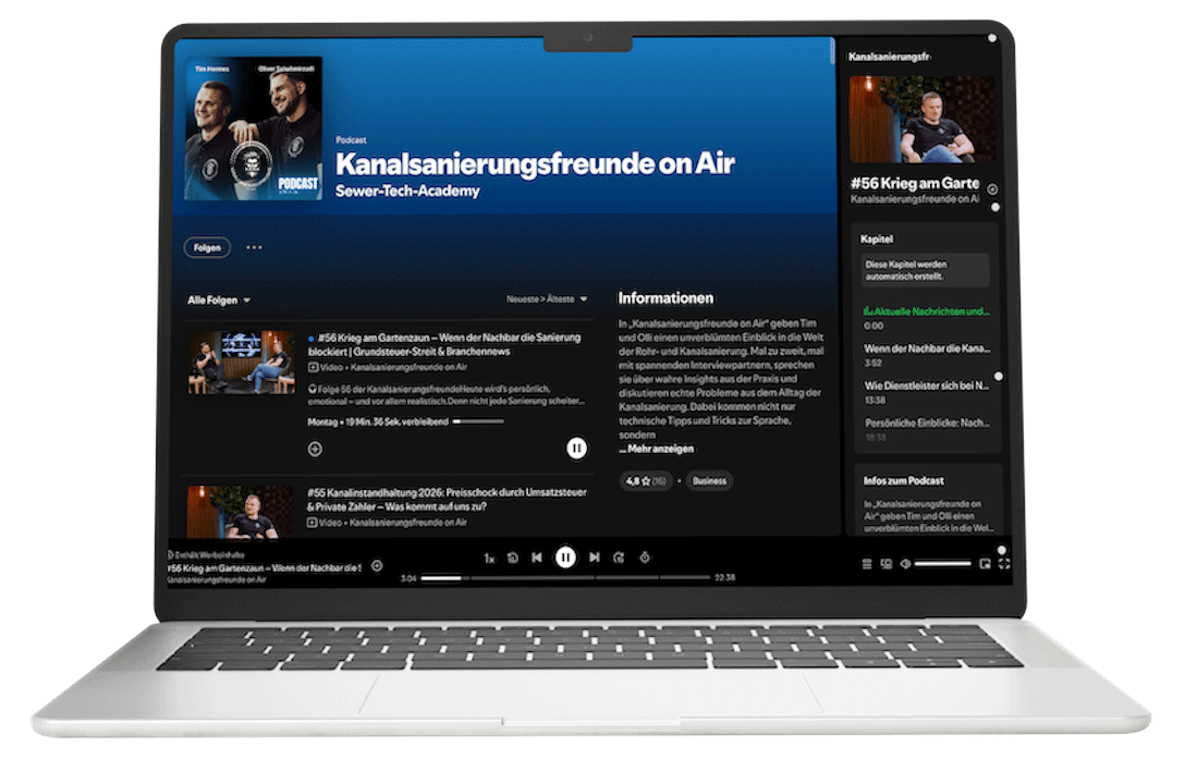 Der Podcast: „Kanalsanierungsfreunde on Air“ Euer Update für die Ohren! In unserem Podcast sprechen wir mit Experten, teilen Insights direkt vom Schacht und diskutieren über die Trends, die unsere Branche bewegen. Authentisch, informativ und garantiert ohne Filter. Hör rein und werde Teil der Crew!